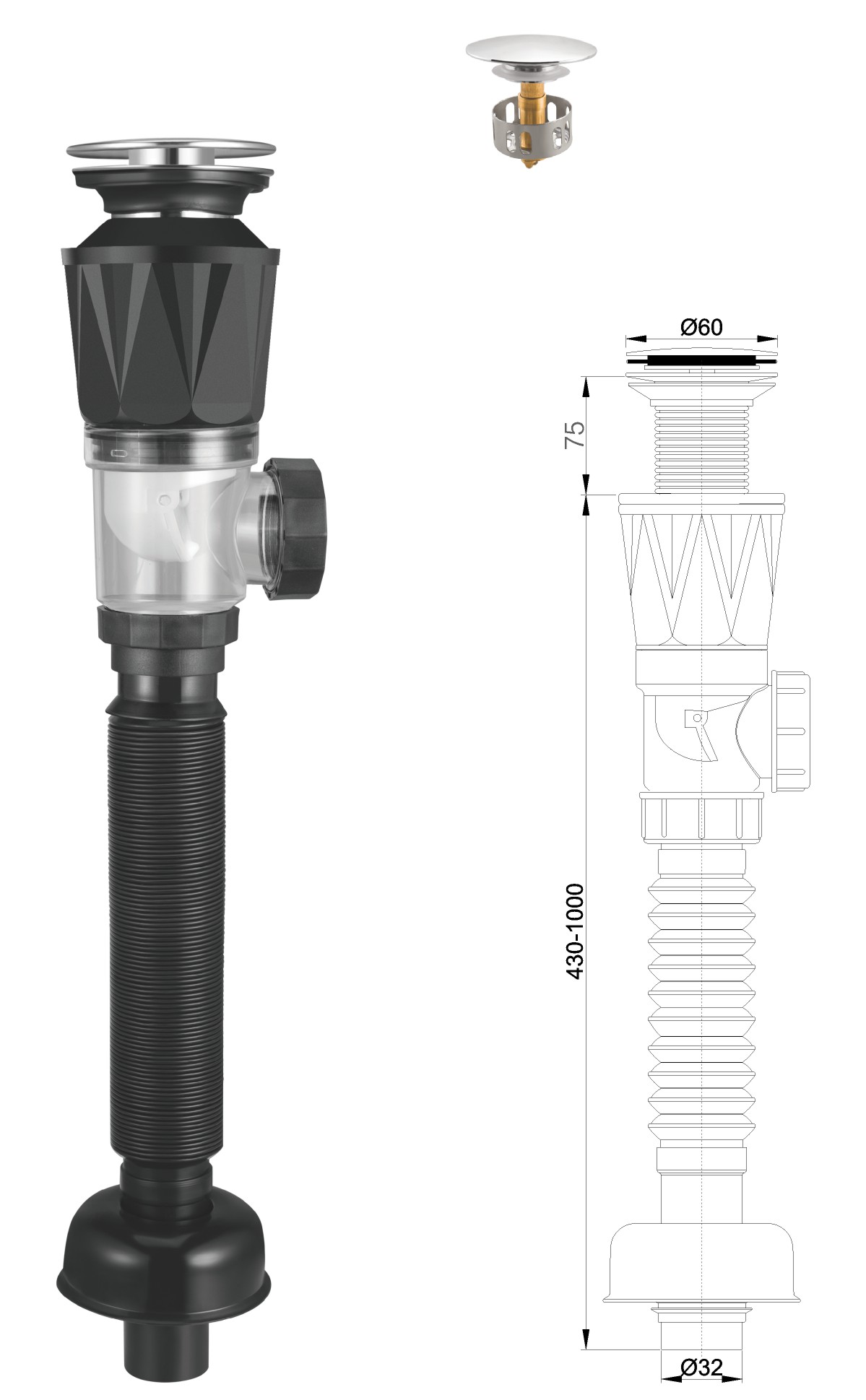 Desagüe de acero inoxidable para lavabo de 1 1/4" con tapón de gomaclic-clac